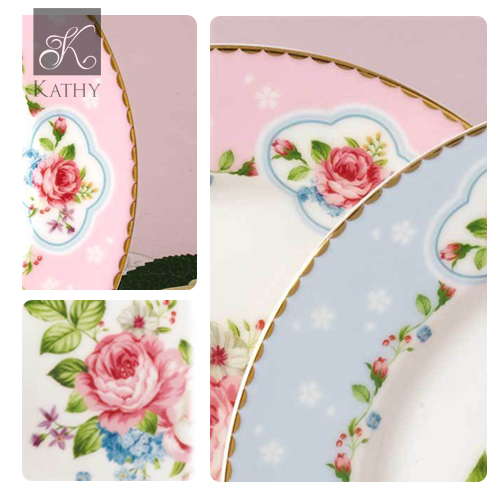 Bộ sứ Cerafloral được thiết kế tinh tế tỉ mỉ, điểm xuyết chút hồng thạch anh trên nền xanh da trời.