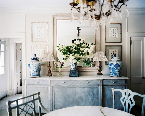 Phòng ăn được trang trí với bộ đĩa hoa văn hồng thạch anh kết hợp xanh dương nhạt dịu dàng trang nhã.