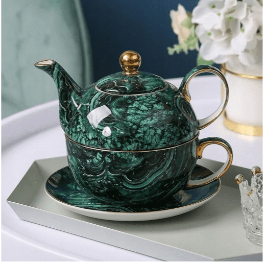 Hồng thạch anh và xanh da trời đậm tạo cảm giác vừa trang nhã vừa sang trọng cho bộ chén phòng khách.