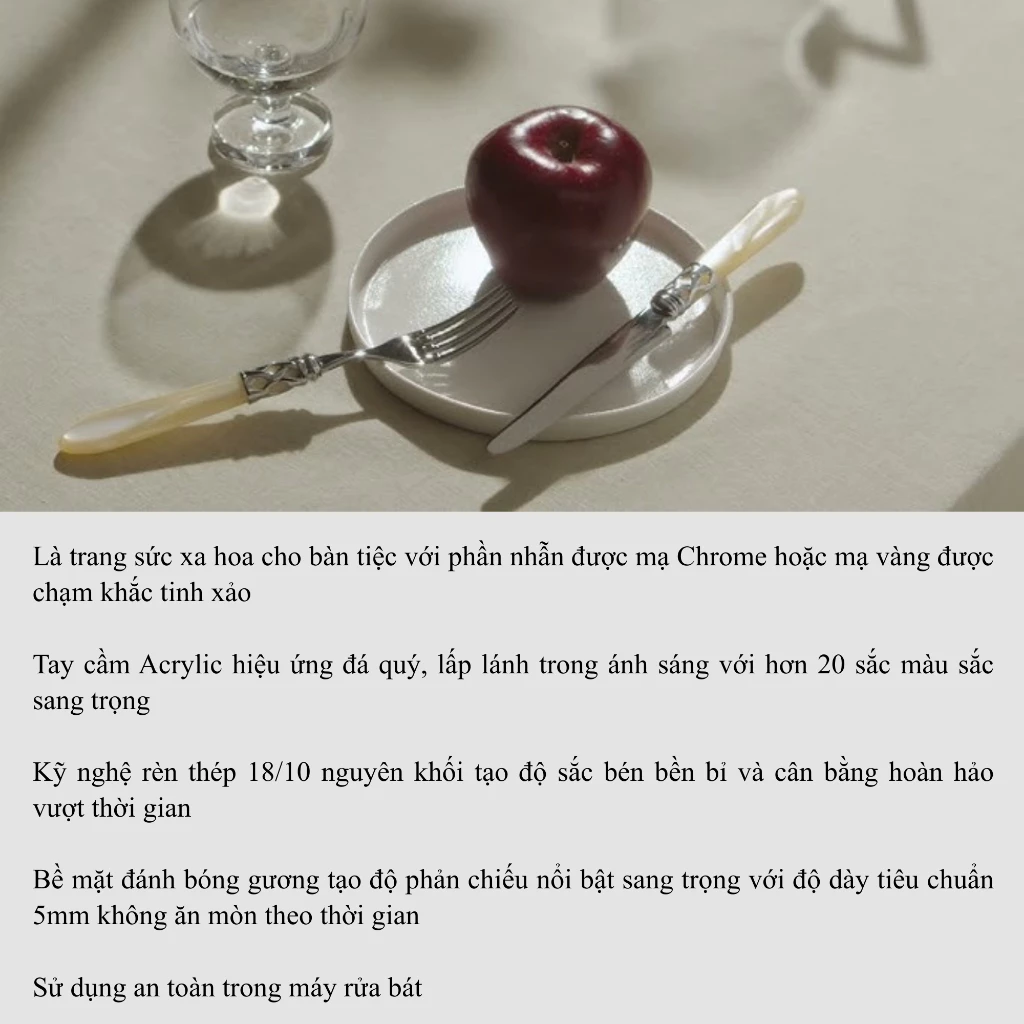 Bộ sưu tập Aladdin được chế tác từ thép không gỉ 18/10, tay cầm acrylic tinh xảo và vòng đan bạc cổ sang trọng. Mỗi món đều là một thiết kế độc bản, hòa quyện nét cổ điển và tinh thần hiện đại. Màu đen tinh tế của Aladdin mang đến sự đồng bộ và sang trọng, dễ dàng bố trí trên mọi phong cách bàn tiệc.