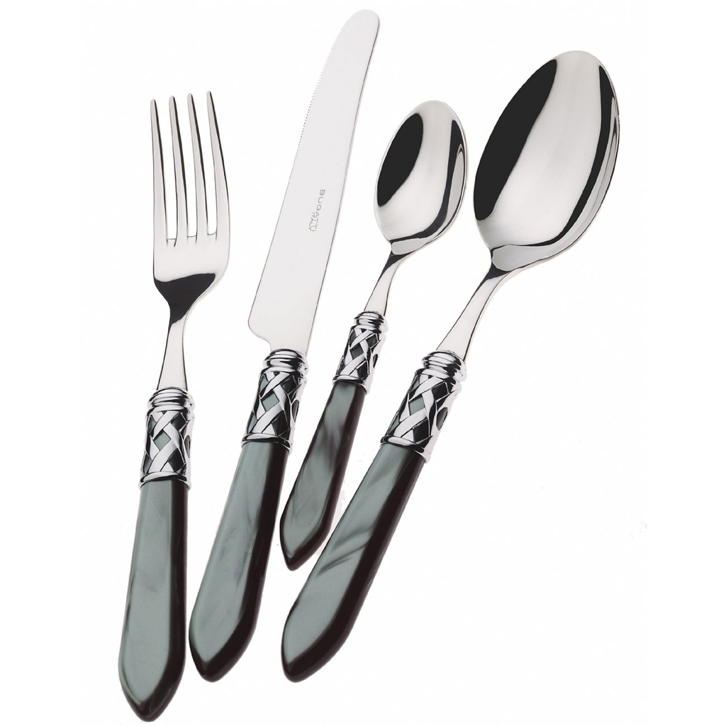 Bộ sưu tập Aladdin được chế tác từ thép không gỉ 18/10, tay cầm acrylic tinh xảo và vòng đan bạc cổ sang trọng. Mỗi món đều là một thiết kế độc bản, hòa quyện nét cổ điển và tinh thần hiện đại. Màu đen tinh tế của Aladdin mang đến sự đồng bộ và sang trọng, dễ dàng bố trí trên mọi phong cách bàn tiệc.