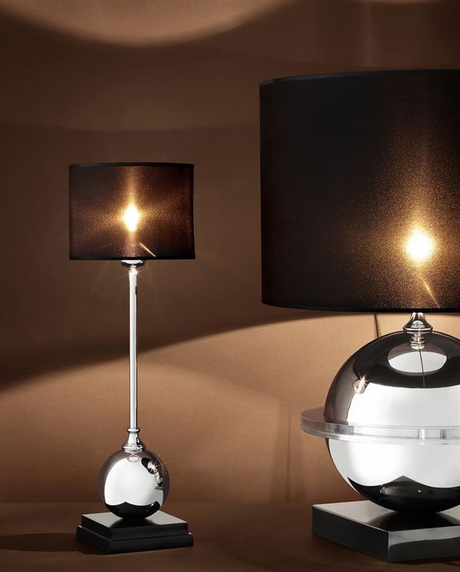 Thêm nét hiện đại cho phòng ăn, phòng khách hoặc phòng ngủ của bạn với Đèn bàn Carnivale tuyệt đẹp. Giải pháp chiếu sáng tuyệt đẹp này có tấm đế bậc thang bằng kính đen giữ cấu trúc chính của đèn bao gồm một quả bóng lớn có thân hình tỏi tây. Đèn có lớp mạ niken bóng và đi kèm chao đèn organza màu đen.