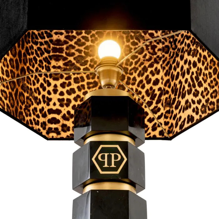 Một mẫu đèn sàn hình lục giác vô cùng đặc biệt với thân đèn bằng đá Cẩm Thạch Đen và đồng thau cổ mang phong cách đặc trưng của Philipp Plein. Đèn có phần chao cùng họa tiết da báo phía bên trong vô cùng đặc biệt. Floor Lamp Hexagon là sự bổ sung hoàn hảo cho căn phòng khách hay phòng ngủ. Một sự thể hiện mạnh mẽ, quyền quý và sang trọng.
