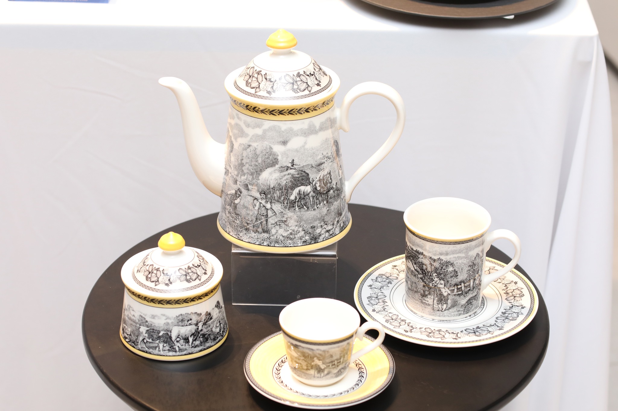 Thiết kế tinh xảo: Ấm trà được trang trí với họa tiết khắc đồng mô tả cảnh đồng quê châu Âu, kết hợp với viền màu vàng kem trang nhã, tạo nên sự hòa quyện giữa nét cổ điển và hiện đại.