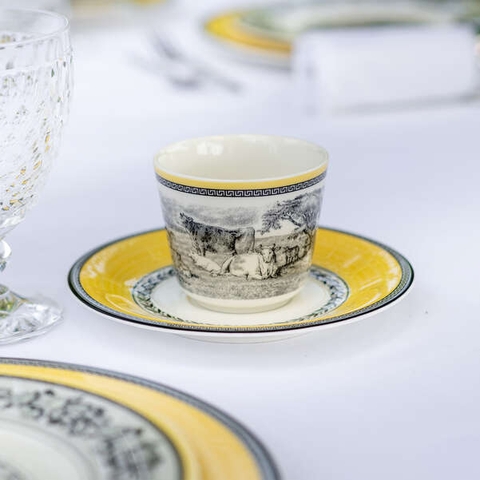 Thiết kế cổ điển: Đĩa lót chén trà được trang trí với họa tiết khắc đồng mô tả cảnh đồng quê châu Âu, kết hợp với viền màu vàng kem, tạo nên sự hòa quyện giữa nét cổ điển và hiện đại.