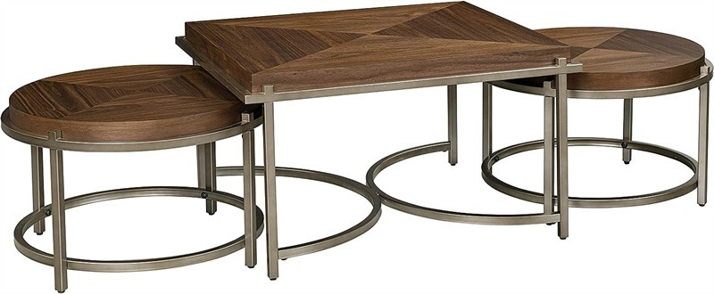 Bàn chính có hình vuông, hai bàn phụ hình tròn, có thể xếp chồng lên nhau để tiết kiệm không gian khi không sử dụng. Mặt bàn được làm từ gỗ óc chó hoặc gỗ công nghiệp vân gỗ óc chó, mang đến vẻ đẹp tự nhiên và ấm áp. Khung bàn được làm bằng kim loại sơn tĩnh điện màu đồng, tạo điểm nhấn cho không gian.