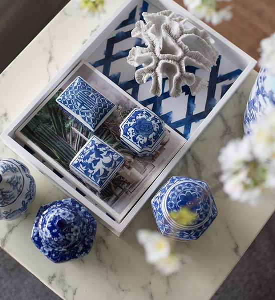 Hoặc bạn cũng có thể trang trí trên bàn mĩ phẩm cá nhân của mình bằng những hộp gốm sứ màu xanh trắng nhỏ gọn dùng để đựng đồ trang sức, son phấn,…